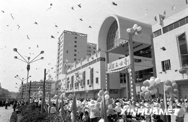 這是1992年建成開業(yè)的義烏第四代小商品市場(chǎng)的資料照片。同年,義烏小商品市場(chǎng)更名為“浙江省義烏市中國(guó)小商品城”。1994年,義烏小商品市場(chǎng)成交額突破100億元。 新華社發(fā)