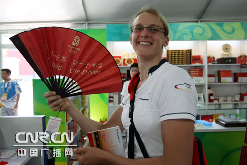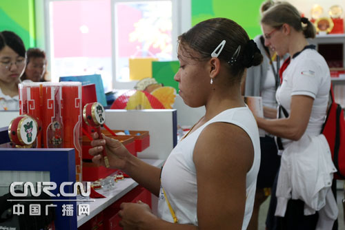 8月2日,一名德國(guó)運(yùn)動(dòng)員在奧運(yùn)村特許商品店選購(gòu),具有中國(guó)傳統(tǒng)特色的商品受到運(yùn)動(dòng)員們的喜愛。中廣網(wǎng)記者邱翔 攝