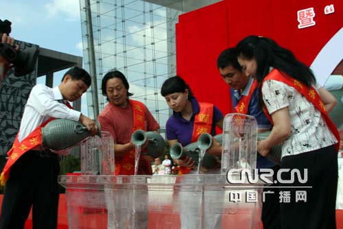 杭州是一座“五水共導(dǎo)”的城市,在啟動(dòng)儀式上,還特別進(jìn)行了“五水共導(dǎo)”儀式。市民代表把取自錢塘江、京杭大運(yùn)河、西湖、東海和西溪五大水系的水倒進(jìn)了一個(gè)透明的大鼎里,祝福杭州錢江新城繁榮發(fā)展,人民幸福。