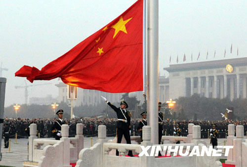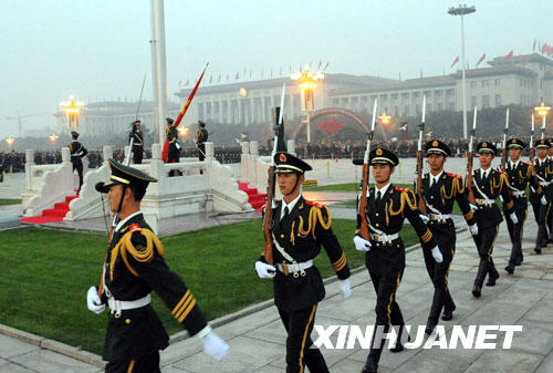 10月1日清晨,武警國(guó)旗護(hù)衛(wèi)隊(duì)護(hù)送國(guó)旗走向北京天安門廣場(chǎng)升旗臺(tái)。當(dāng)日,升國(guó)旗儀式在北京天安門廣場(chǎng)隆重舉行,約19萬群眾前來觀看。 新華社記者 唐召明攝