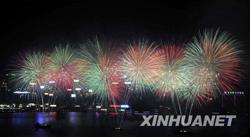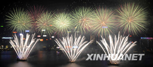 煙花匯演于21時(shí)開始,歷時(shí)23分鐘,共發(fā)射23800枚煙花彈。匯演分為8幕,在《紅旗頌》的背景音樂中,第一幕“日出東方”閃亮登場,天空中綻放出紅色及黃色的“中國心”,代表著赤誠的心,隨即一個(gè)又一個(gè)“五角紅星”放出萬丈光芒,掀起匯演的第一個(gè)高潮;第二幕“卅載輝煌”中,仿照北京奧運(yùn)會(huì)開幕式上“大腳印”的煙花,象征國家正一步一個(gè)腳印地走上強(qiáng)國之路;在接下來的“中華盛世”、“眾志成城”中,繽紛的“大麗花”、“彩紫帶紅花”等異彩紛呈;爆發(fā)力最強(qiáng)的“拉手煙花”象征團(tuán)結(jié)一心,戰(zhàn)勝困難;第五、第六幕是緊扣奧運(yùn)主題的“祥云飄逸”和“百年夢圓”,在北京奧運(yùn)會(huì)主題歌《我和你》的伴奏下,“祥云”升空,“錦冠帶閃”,各種色彩交織閃爍,讓奧運(yùn)激情再次點(diǎn)燃香江;到了第七幕“祖國長春”,雄壯有力的《歌唱祖國》回蕩在維多利亞港灣,煙花的種類越來越多,越來越耀眼、震撼,萬花爭妍斗麗,市民目不暇接,驚呼聲、贊嘆聲此起彼伏;當(dāng)最后一幕“明珠璀璨”開始的時(shí)候,煙花表演到達(dá)最高潮,90秒不間斷高速綻放的煙火,以排山倒海之勢,形成一個(gè)萬紫千紅、色彩斑斕的“寬屏幕”,在場觀眾歡笑鼓掌,共同祝愿祖國繁榮昌盛,祝愿香港明天更加美好。