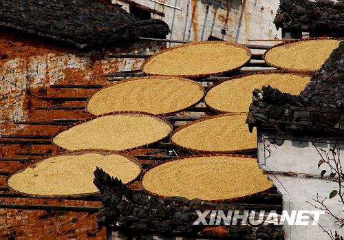 10月2日拍攝的婺源縣農(nóng)村房前屋后晾曬的金燦燦的稻谷。“十一”黃金周正值水稻秋收的繁忙季節(jié),江西省婺源縣許多返鄉(xiāng)的在外務(wù)工人員和留守家中的親人一起投身到收獲秋糧的勞動中,農(nóng)家屋頂和木柵上曬滿了金黃的稻谷,與徽派民居構(gòu)成了一幅幅美麗的“曬秋”畫卷。新華社發(fā)(王國紅 攝)
