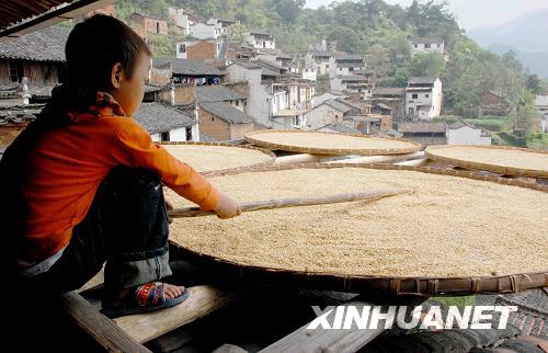 10月2日,婺源縣農(nóng)村的一名兒童在翻曬稻谷。新華社發(fā)(王國紅 攝)