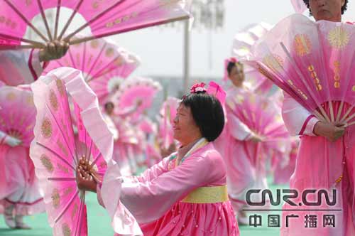 汽車一進(jìn)延吉市,就傳來了朝鮮族民謠的聲音,不遠(yuǎn)處的廣場上,正在上演一臺(tái)朝鮮族風(fēng)情歌舞。粉紅的長裙隨著姑娘們歡快的舞步飄動(dòng)著,小伙子帽子上長長的絲帶在飛旋。