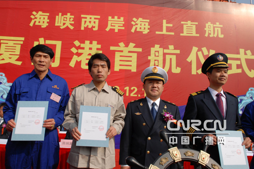 廈門海事局肖躍華局長(zhǎng)向廈門首航直航船長(zhǎng)發(fā)放“直航船舶出港許可證”