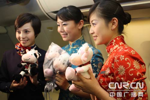 乘務(wù)員正在展示首航航班上將向旅客贈(zèng)送的小禮品