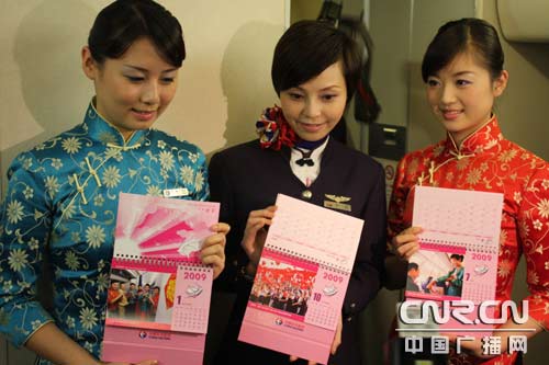 乘務(wù)組在客艙中展示航班上將向旅客贈(zèng)送的精美臺(tái)歷