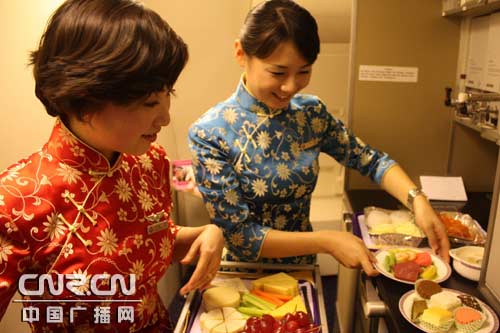 首航乘務(wù)員正在客艙中展示餐食的服務(wù)程序