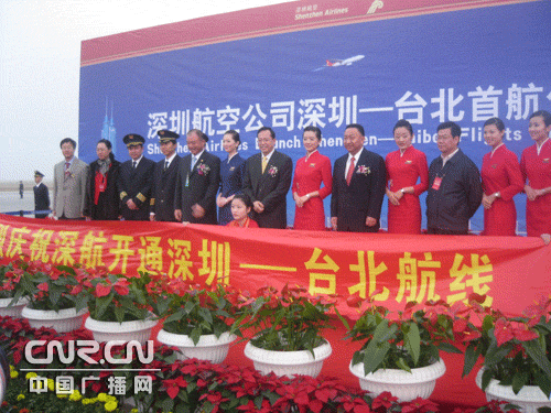 | 中廣網(wǎng)深圳12月15日(記者鄭柱子)今天清晨7點(diǎn)20分,深圳航空公司的B738-800飛機(jī)滿載125名旅客,從深圳寶安國(guó)際機(jī)場(chǎng)起飛,飛往臺(tái)北松山機(jī)場(chǎng)。這是大陸直航臺(tái)灣的首班飛機(jī),也標(biāo)志著兩岸“三通”基本實(shí)現(xiàn)。 深航首飛“深圳-臺(tái)北”航班是“陳江會(huì)”后直航常態(tài)包機(jī)的第一架航班。按照民航局公布的方案,深航每周五、日兩班由深圳直航臺(tái)北松山機(jī)場(chǎng),該航班的開通將極大地便利珠三角地區(qū)深圳、東莞、惠州及周邊地區(qū)旅客往來深圳和臺(tái)北之間。