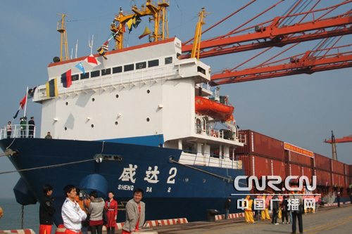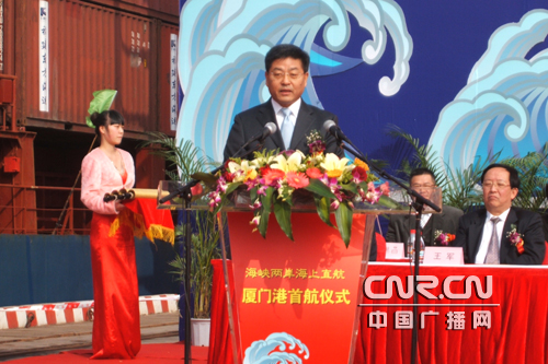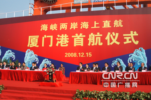 中廣網(wǎng)廈門12月15日消息(記者 劉立忠 郭婕妤 實(shí)習(xí)記者 黃志霜)今天上午10點(diǎn),海峽兩岸海運(yùn)直航廈門首航儀式在廈門港區(qū)隆重舉行。廈門市政協(xié)主席陳修茂宣布首航船舶起航,廈門港“盛達(dá)2”輪、“曉江”輪、“華航1”和“錦春”輪緩緩離開廈門港碼頭分別直航高雄港、臺中港和基隆港,標(biāo)志著廈門與臺灣海運(yùn)直航常態(tài)化工作的正式開始。 國家交通運(yùn)輸部水運(yùn)司副司長楊贊出席了首航儀式并且致辭。他說,兩岸直航不僅有利于充分利用臺灣海峽的戰(zhàn)略通道作用,構(gòu)建服務(wù)海峽東西岸以及亞太地區(qū)的東南沿海港口區(qū)域,更有利于兩岸更便捷的運(yùn)輸,更暢通的資金流動(dòng)和更優(yōu)化的資源配置,也將進(jìn)一步擴(kuò)大兩岸的人員來往,促進(jìn)兩岸經(jīng)貿(mào)交流與合作,對推進(jìn)兩岸關(guān)系的和平發(fā)展進(jìn)程具有重大的意義。楊司長同時(shí)強(qiáng)調(diào),廈門應(yīng)緊緊抓住兩岸直航的歷史機(jī)遇,充分發(fā)揮廈門得天獨(dú)厚的港口優(yōu)勢,進(jìn)一步加強(qiáng)與各有關(guān)部門的協(xié)作,為兩岸人員的往來和經(jīng)濟(jì)合作提供更加安全、更加便捷、更加暢通的交通運(yùn)輸服務(wù),從而進(jìn)一步增強(qiáng)兩岸人民的福祉,譜寫兩岸海運(yùn)的新篇章。