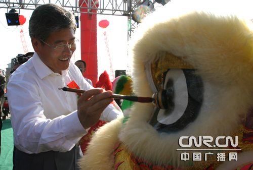 寧夏回族自治區(qū)黨委常委、銀川市委書(shū)記崔波在文化城開(kāi)業(yè)慶典上為“獅”點(diǎn)睛