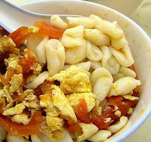 貓耳朵:又叫抿圪斗。無論蕎面、白面、莜面、玉米面、高粱面都可以制作。揪一小塊面劑放手掌上用拇指一捻,一推而成一貓耳朵狀,煮熟澆上鹵汁,便可食用。有的地方把白面碾薄切成小丁,用筷子頭一擰一轉(zhuǎn)成一個(gè)個(gè)小貓耳朵狀,更是叫絕。