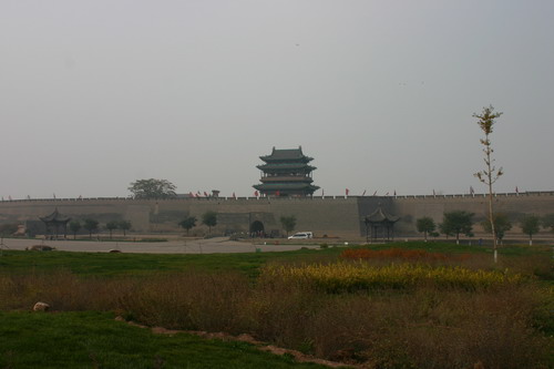 平遙古城,與同為第二批國家歷史文化名城的四川閬中、云南麗江、安徽歙縣并稱為“保存最為完好的四大古城”。今山西省平遙縣舊稱“古陶”。明朝初年,為 防御外族南擾,始建城墻,洪武三年(公元一三七零年)在舊墻垣基礎(chǔ)上重筑擴(kuò)修,并全面包磚。以后景德、正德、嘉靖、隆慶和萬歷各代進(jìn)行過十次在的補(bǔ)修和修葺,更新城樓,增設(shè)敵臺(tái)?滴跛氖辏ü黄吡闳辏┮蚧实畚餮猜方(jīng)平遙,而筑了四面大城樓,使城池更加壯觀。平遙城墻總周長6163米,墻高約12米,把面積約2.25平方公里的平遙縣城一隔為兩個(gè)風(fēng)格迥異的世界。城墻以內(nèi)街道、鋪面、市樓保留明清形制;城墻以外稱新城。這是一座古代與現(xiàn)代建筑各成一體、交相輝映、令人遐思不已的佳地。明信片的主圖再現(xiàn)了這一風(fēng)采。