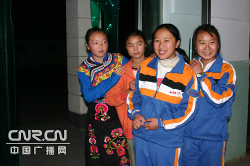 幾個(gè)來自汶川的羌族女孩兒。穿民族服裝的小女孩剛參加完學(xué)校的文藝演出。