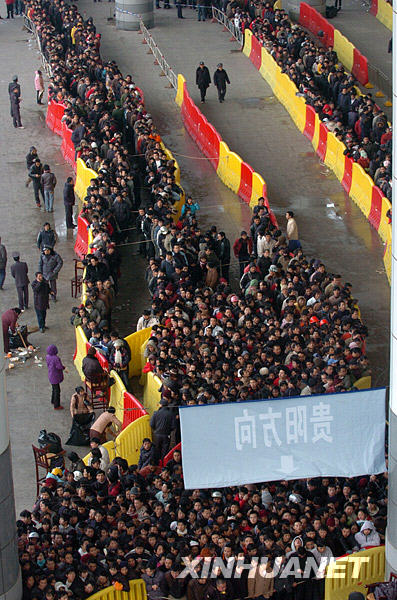 當(dāng)日,浙江寧波火車站在寧波國(guó)際會(huì)展中心設(shè)置的臨時(shí)售票點(diǎn)領(lǐng)號(hào)窗口和售票窗口同時(shí)開(kāi)放,預(yù)售10天后的春運(yùn)火車票,上萬(wàn)人前來(lái)排隊(duì)買票。新華社發(fā)(張培堅(jiān) 攝)