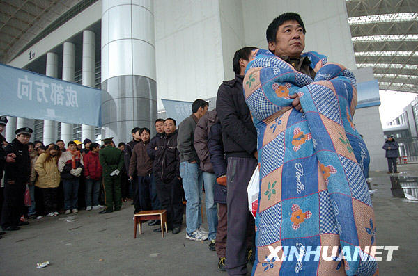 1月2日,在寧波國(guó)際會(huì)展中心臨時(shí)售票點(diǎn),一名排了兩天隊(duì)的購(gòu)票者披著棉被等待買票。新華社發(fā)(張培堅(jiān) 攝)