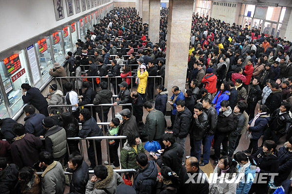 1月3日,在西安火車站,人們排隊(duì)購(gòu)買火車票。新華社發(fā)(袁景智 攝)