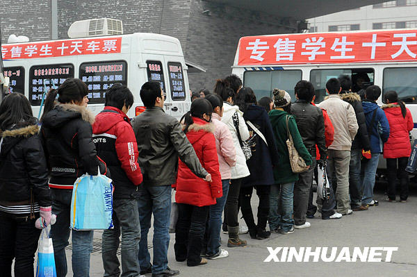1月3日,在西安火車站一流動(dòng)售票點(diǎn),許多學(xué)生排隊(duì)購(gòu)買火車票。新華社發(fā)(袁景智 攝) |
