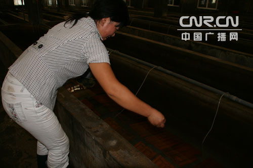 養(yǎng)殖工人正在往幼苗池中投放飼料—中廣網(wǎng)記者吳菁攝