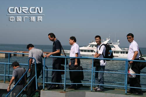 黃渤海報(bào)道組乘坐海船抵達(dá)長(zhǎng)?h—中廣網(wǎng)記者吳菁攝