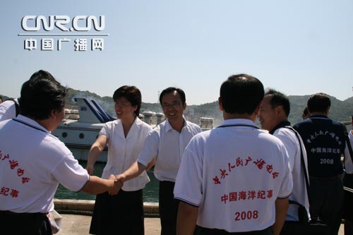 | 中廣網(wǎng)長(zhǎng)海9月2日消息(記者吳菁)今日上午10點(diǎn)30分,中央臺(tái)“2008中國(guó)海洋紀(jì)事”黃渤海報(bào)道組一行15人乘坐海船抵達(dá)長(zhǎng)?h進(jìn)行采訪。