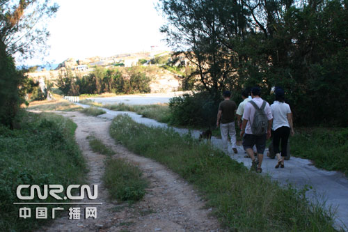 南海組記者張丹麗在狹窄的小路上采訪遮浪島的工作人員(中廣網(wǎng)記者王磊 攝)