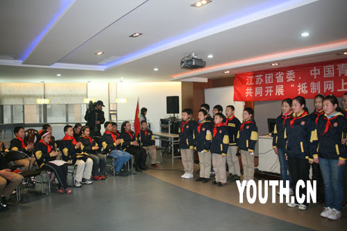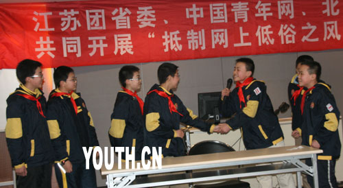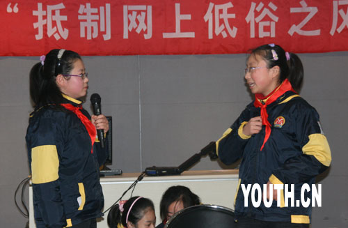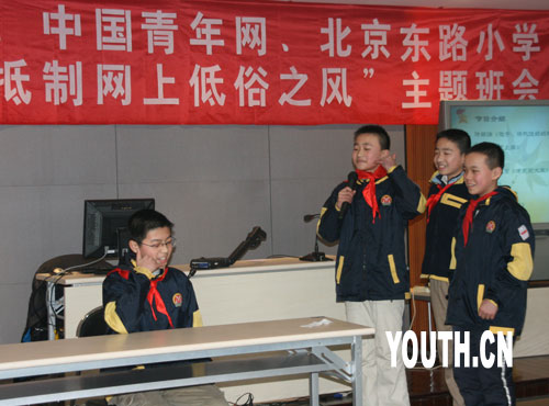 | 中廣網(wǎng)北京2月25日消息 “網(wǎng)絡(luò)魅力大,神奇不可言。低俗不要碰,黃頁不入眼。求知是目的,游戲莫貪玩。上網(wǎng)要節(jié)制,健康是本錢!边@是江蘇省南京市北京東路小學六一中隊的同學們今天在“抵制網(wǎng)上低俗之風”主題班會上面向全校同學們發(fā)出的倡議,也是他們給自己定下的健康上網(wǎng)文明公約。由此,本網(wǎng)參與主辦的“抵制網(wǎng)上低俗之風”系列主題班會拉開帷幕。