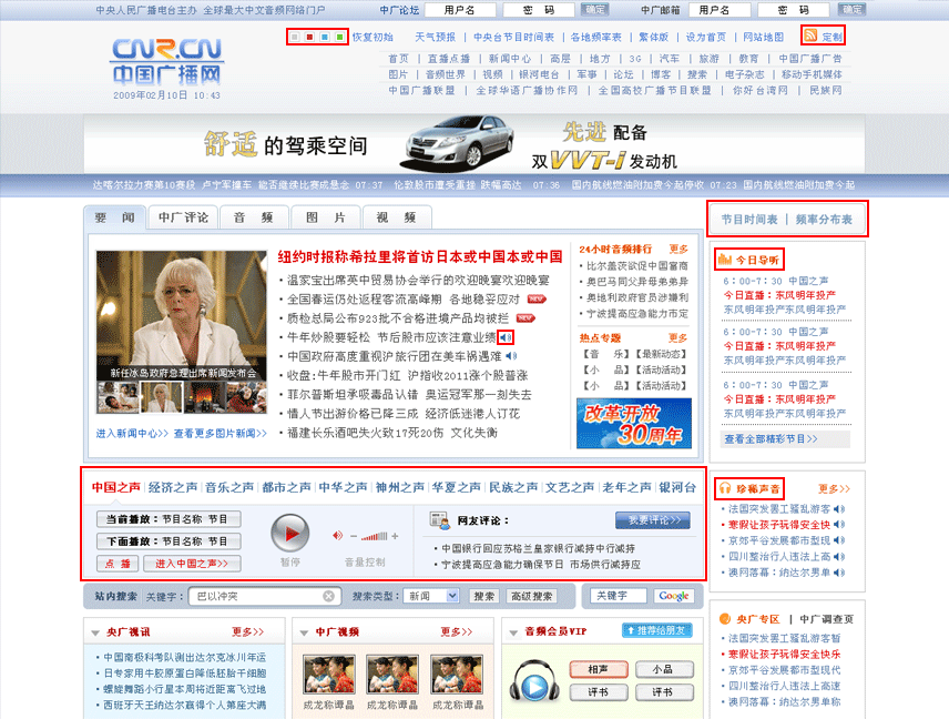 2009年新年伊始,中國廣播網(wǎng)全新改版。此次改版繼續(xù)保持中央新聞媒體權(quán)威性,同時在首頁特別突出在線直播、在線點(diǎn)播等音頻資源特色,在線提供中央人民廣播電臺所屬十套節(jié)目、中國廣播網(wǎng)銀河臺和數(shù)字廣播等五套節(jié)目的網(wǎng)上直播,并采用網(wǎng)絡(luò)流行的WEB2.0技術(shù)為網(wǎng)站提速,全力打造全球最大的中文音頻網(wǎng)絡(luò)門戶。