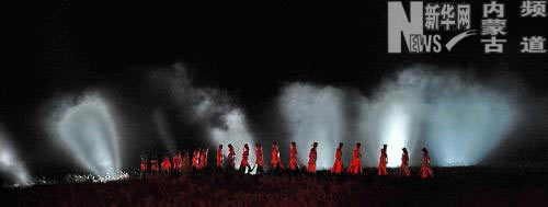草原上的實(shí)景演出展示親人思念遠(yuǎn)征將士的場(chǎng)景(8月15日攝)。演繹成吉思汗戎馬一生的大型實(shí)景演出近期在內(nèi)蒙古呼倫貝爾草原上演,實(shí)景演出在戶外的天然草原上搭建了100多個(gè)蒙古包、2000多米的天際線和500多個(gè)數(shù)碼音響設(shè)備,由600多名身著民族服裝的演員以及100多匹駿馬和巨大的羊群出演,營(yíng)造出氣勢(shì)宏大的天然草原劇場(chǎng)。60分鐘的演出分為序幕、降生、征戰(zhàn)、思念、大典等八個(gè)部分,展示了成吉思汗從出生到故去的宏大的歷史故事,同時(shí)也展示了蒙古族的歷史、文化、生產(chǎn)和生活習(xí)俗。新華社記者 李欣 攝