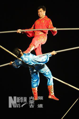8月16日,有“高空王子”之稱的阿迪力(上)與徒弟在閉幕式上為觀眾表演。當(dāng)日,第七屆內(nèi)蒙古自治區(qū)少數(shù)民族傳統(tǒng)體育運(yùn)動會在鄂爾多斯市閉幕。新華社記者鄭煥松攝