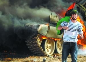 3月26日,利比亞艾季達(dá)比亞,一名反對(duì)派武裝扛著旗幟走過遭聯(lián)軍轟炸后燃燒的坦克。3月26日,利比亞反政府武裝在西方多國聯(lián)軍的空襲掩護(hù)下,于當(dāng)天占領(lǐng)了東部石油重鎮(zhèn)艾季達(dá)比亞。這也是聯(lián)軍轟炸行動(dòng)后,首個(gè)被反對(duì)派武裝奪回的重鎮(zhèn)。 東方IC供圖