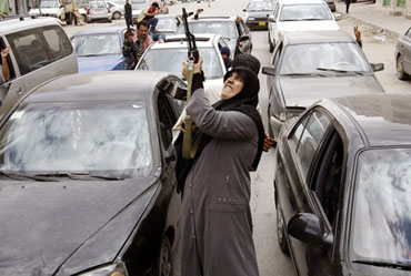 3月19日,利比亞第二大城市班加西,一名手持AK-47步槍的反對派婦女支持者在聽說擊退卡扎菲政府軍后鳴槍慶祝。反政府武裝發(fā)言人稱周六他們已將卡扎菲部隊(duì)趕出了班加西城。