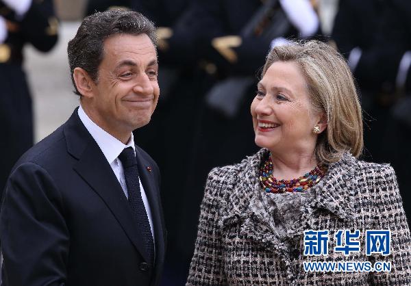 3月19日,法國總統(tǒng)薩科齊(左)在巴黎愛麗舍宮迎接前來參加巴黎峰會的美國國務(wù)卿希拉里·克林頓。當(dāng)日,法國召開旨在落實聯(lián)合國安理會關(guān)于利比亞決議的國際峰會。 新華社記者高靜攝