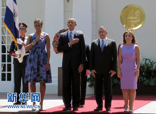3月22日,在薩爾瓦多首都圣薩爾瓦多的總統(tǒng)府,美國總統(tǒng)奧巴馬(左二)與夫人出席薩總統(tǒng)富內(nèi)斯和夫人為其舉行的歡迎儀式。新華社記者劉璇攝