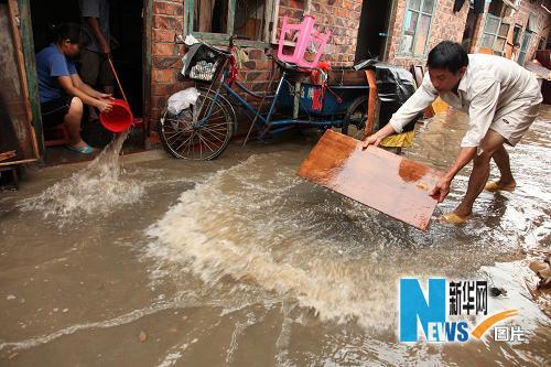 6月15日,在南寧市廣西醫(yī)科大學(xué)第二附屬醫(yī)院附近的居民區(qū),居民在屋前排水。新華社發(fā)(唐輝吉 攝)