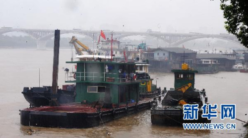 大雨中長沙湘江邊停泊的船只(6月17日攝)。