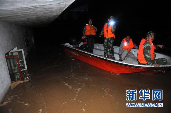 6月22日,南昌市消防支隊(duì)官兵在江西撫州市羅針鎮(zhèn)胡溪萬家村尋找被洪水圍困的村民。 6月21日傍晚,江西省撫州市唱?jiǎng)P堤發(fā)生決口,威脅下游臨川區(qū)湖南、羅湖、唱?jiǎng)P、羅針和云山等5個(gè)鄉(xiāng)鎮(zhèn)14.5萬人口、京福高速公路、316國道以及12萬畝糧田的安全。江西省委、省政府主要領(lǐng)導(dǎo)獲悉后,立即對搶險(xiǎn)工作作出部署,要求迅速轉(zhuǎn)移群眾,不惜一切代價(jià),保護(hù)人民生命財(cái)產(chǎn)安全。目前,撫州市、臨川區(qū)已經(jīng)在組織人員轉(zhuǎn)移。駐贛部隊(duì)和武警、消防官兵正在緊急救援。新華社記者周科 攝