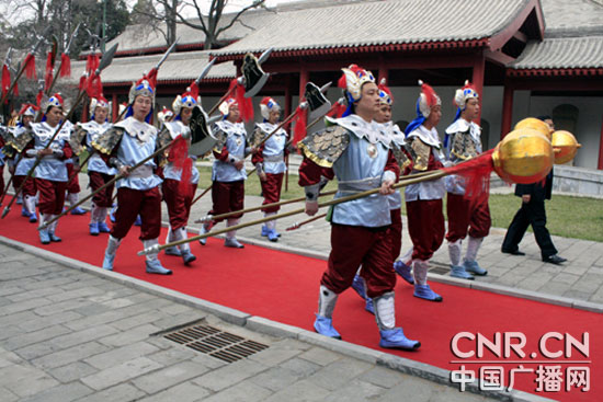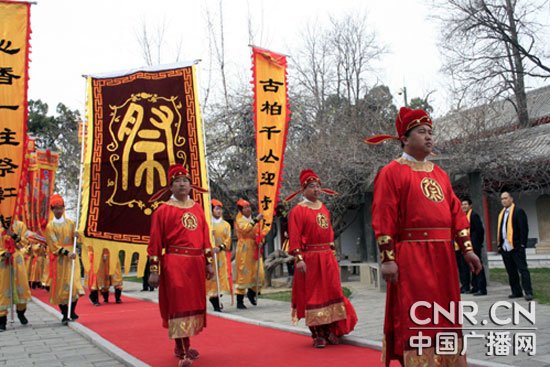 上午九點(diǎn)五十分,公祭軒轅黃帝大典正式開始,鐘鼓齊鳴,擊鼓34聲代表了全國34個(gè)省、市、自治區(qū)和特別行政區(qū)對黃帝始祖的敬意。全國人大副委員長烏云其木格,全國政協(xié)副主席、中央統(tǒng)戰(zhàn)部部長、中華海外聯(lián)誼會(huì)會(huì)長杜青林及中央各部委和各省、自治區(qū)、直轄市的代表,臺(tái)灣同胞、港澳同胞、海外僑胞代表,依次在軒轅大殿前向軒轅黃帝敬獻(xiàn)花籃。陜西省省長袁純清恭讀了公祭軒轅黃帝祭文。