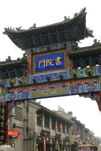 書院門570多米長的街道,集中了上百家店鋪。在二三層雕欄樓閣上,掛著一色的黑底金字牌匾,書寫著文萃閣、醉書軒、聚香齋、皓月宮等店名。這里的店鋪門面既不像江南商號那樣纖巧秀麗,也不同于北京大柵欄那樣富麗堂皇,而是古樸敦厚,門面很少有繁瑣的裝飾,牌匾、楹聯(lián),還有深狹的門道,顯示了一種儒雅祥瑞、深藏若虛的氛圍。商家所售的商品有各種旅游紀念品、工藝品等。然而墨香的古文化街最能體現(xiàn)特色的商品當屬種類繁多的文房四寶、書法字幅、國畫卷軸、碑帖拓片、藍田美玉,以及古老的樂器“塤”。