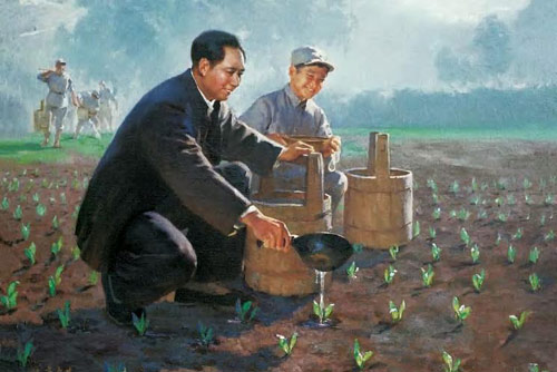 毛主席一手扶著水桶,一手拿著瓢。瓢里的水緩緩地流到小苗上。