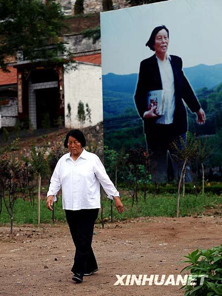 資料圖片:申紀蘭從印有她形象的大幅廣告牌前走過。她已經(jīng)成為“西溝精神”的一個標志(2009年7月20日攝)。 新華社發(fā)