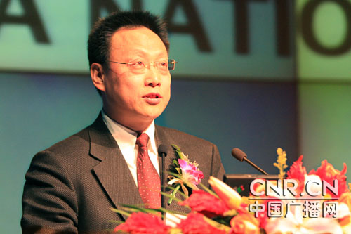 中央人民廣播電臺副臺長趙子忠闡述新標識系統(tǒng)設(shè)計理念(中廣網(wǎng)記者紀樂樂 陳曉冉 攝)