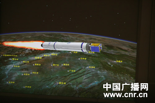在北京飛控中心指揮大廳里傳來的西昌衛(wèi)星發(fā)射中心現(xiàn)場(chǎng)照片,圖為嫦娥2號(hào)3D模擬飛行