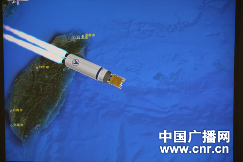 在北京飛控中心指揮大廳里傳來的西昌衛(wèi)星發(fā)射中心現(xiàn)場照片,圖為嫦娥2號(hào)3D模擬飛行
