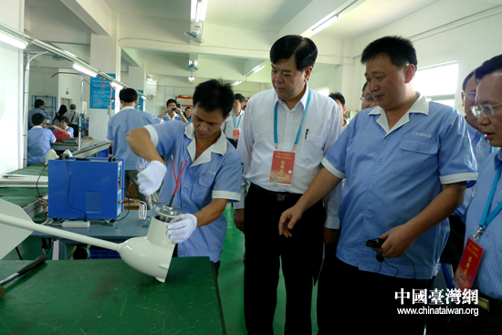 參加第六屆兩岸經(jīng)貿(mào)文化論壇的新能源組參訪團(tuán)代表9日來到廣州紅鷹能源科技有限公司參訪(中國臺(tái)灣網(wǎng) 李徽 攝)