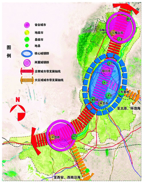 近年來,寧夏回族自治區(qū)黨委、政府確定了向黃河靠攏的發(fā)展思路,大力實施中心城市帶動戰(zhàn)略。2008年,寧夏進入了城市化加速發(fā)展時期,全區(qū)城市化率達到45.5%,人均GDP超過2000美元,對經(jīng)濟社會發(fā)展的推動作用日益凸顯。目前,寧夏沿黃河分布的銀川、石嘴山、吳忠、中衛(wèi)、平羅、青銅峽、靈武、賀蘭、永寧、中寧10個城市以43%的國土面積,集中了寧夏全區(qū)57%的人口、80%的城鎮(zhèn)、90%的城鎮(zhèn)人口,創(chuàng)造了寧夏90%以上的GDP和財政收入,已初具城市帶雛形。今后,寧夏將全面推進這一地帶的城市化進程,著力打造生命保障線、搶險交通線、經(jīng)濟命脈線、特色城市線、生態(tài)景觀線和文化展示線。加快公交互通、金融同城、電訊同區(qū)、電力同網(wǎng)、信息共享步伐,形成以首府銀川市為中心的“一小時經(jīng)濟圈”,以石嘴山市、中衛(wèi)市、吳忠市三個沿黃地級市為次中心的“半小時通勤圈”,促進中部干旱地區(qū)和南部山區(qū)10個縣(區(qū))的人口向沿黃地區(qū)聚攏。
