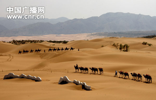 沙坡頭景區(qū)內(nèi),駱駝們接送游客(攝影 陳鐘)