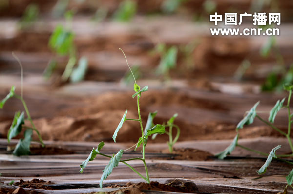 沙漠里沒有水,日照條件是搞大棚最大的優(yōu)勢(shì)。盡管母親河就在眼前,可沙漠地區(qū)大規(guī)模灌溉的教訓(xùn)已有前車之鑒,用水也只能是用少量的水。于是,滴灌技術(shù)進(jìn)入了中衛(wèi)人的視野,田間一根根黑色的滴灌管順著作物種植方向,像人體的血脈一樣不斷向前延伸。水蒸氣在大棚頂薄膜上凝結(jié)后被重新利用,避免水分的過多流失和浪費(fèi)。從此人類有了一身新的“盔甲”,沙漠只能望“棚”興嘆,訴說著自身的無奈。而產(chǎn)自溫棚的一些水果在“沙水兩重天”的歷練中,新鮮出爐,品嘗起來“原汁原味”。中衛(wèi)市的香山硒砂瓜曾被定為北京奧運(yùn)會(huì)特供食品,享譽(yù)天下。