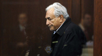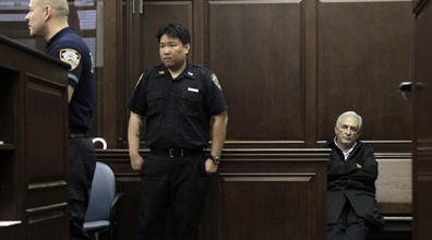 資料圖片:5月16日,國際貨幣基金組織總裁多米尼克·斯特勞斯-卡恩(右)出席紐約曼哈頓刑事法院舉行的聽證會。在...