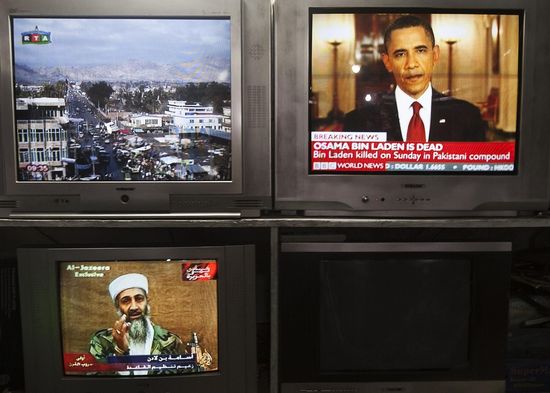 5月2日,阿富汗一家商店里的電視在播放奧巴馬宣布拉登已經(jīng)死亡的消息。